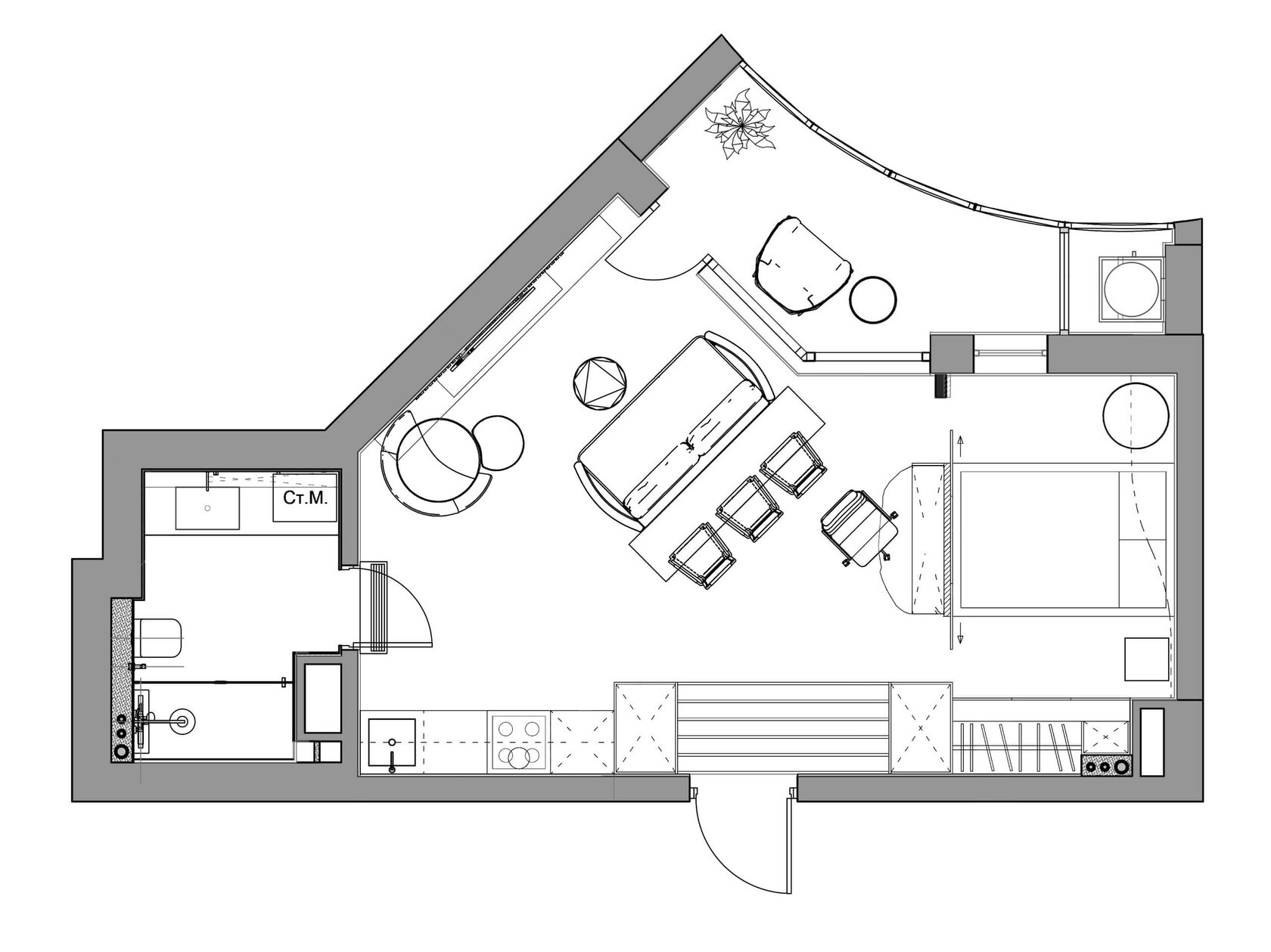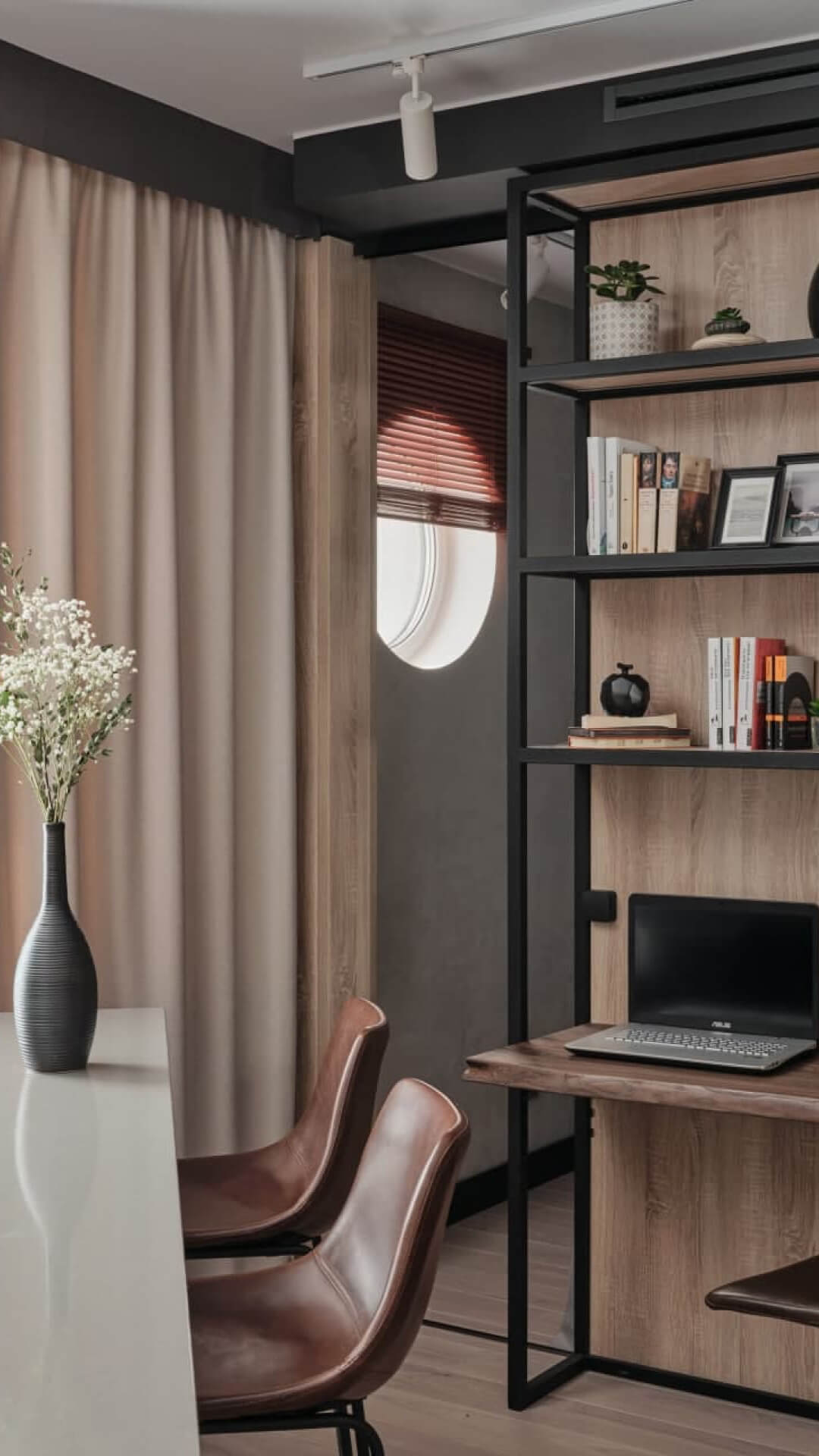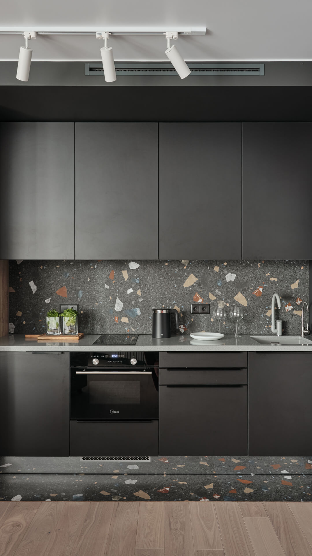 Petit appartement fait en colories sombres et élégants. Nous avons supprimé toutes les cloisons de l'appartement, en conservant seulement celle entre la salle de bains et le séjour. Nous avons ainsi créé un espace ouvert et fonctionnel, divisé par des meubles multifonctionnels encastrés et sur-mesure.