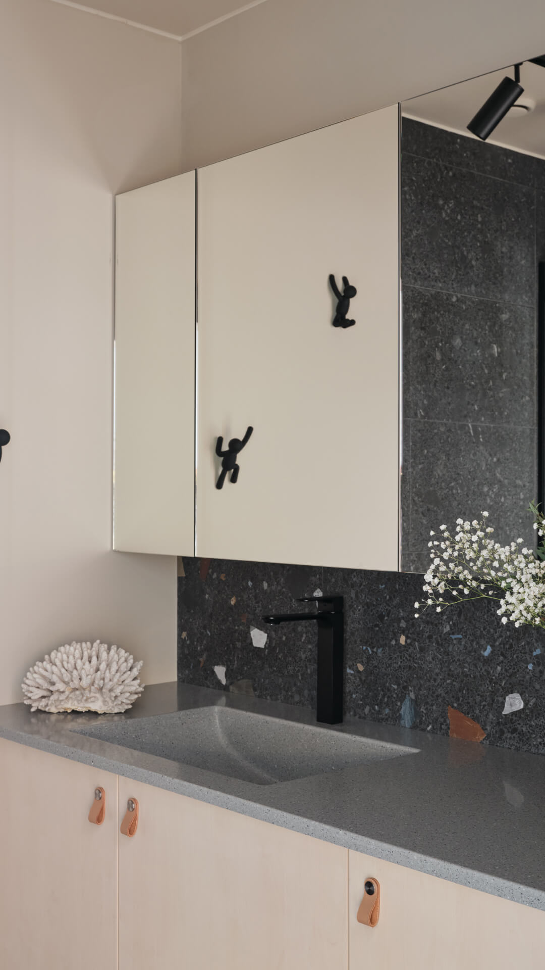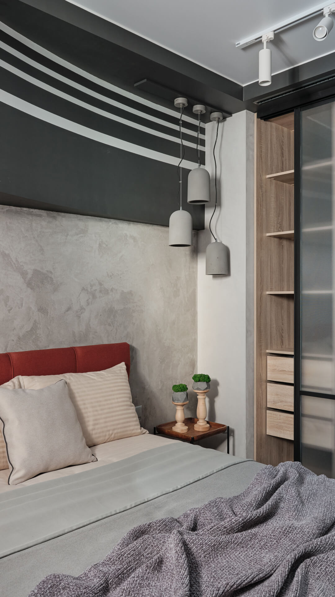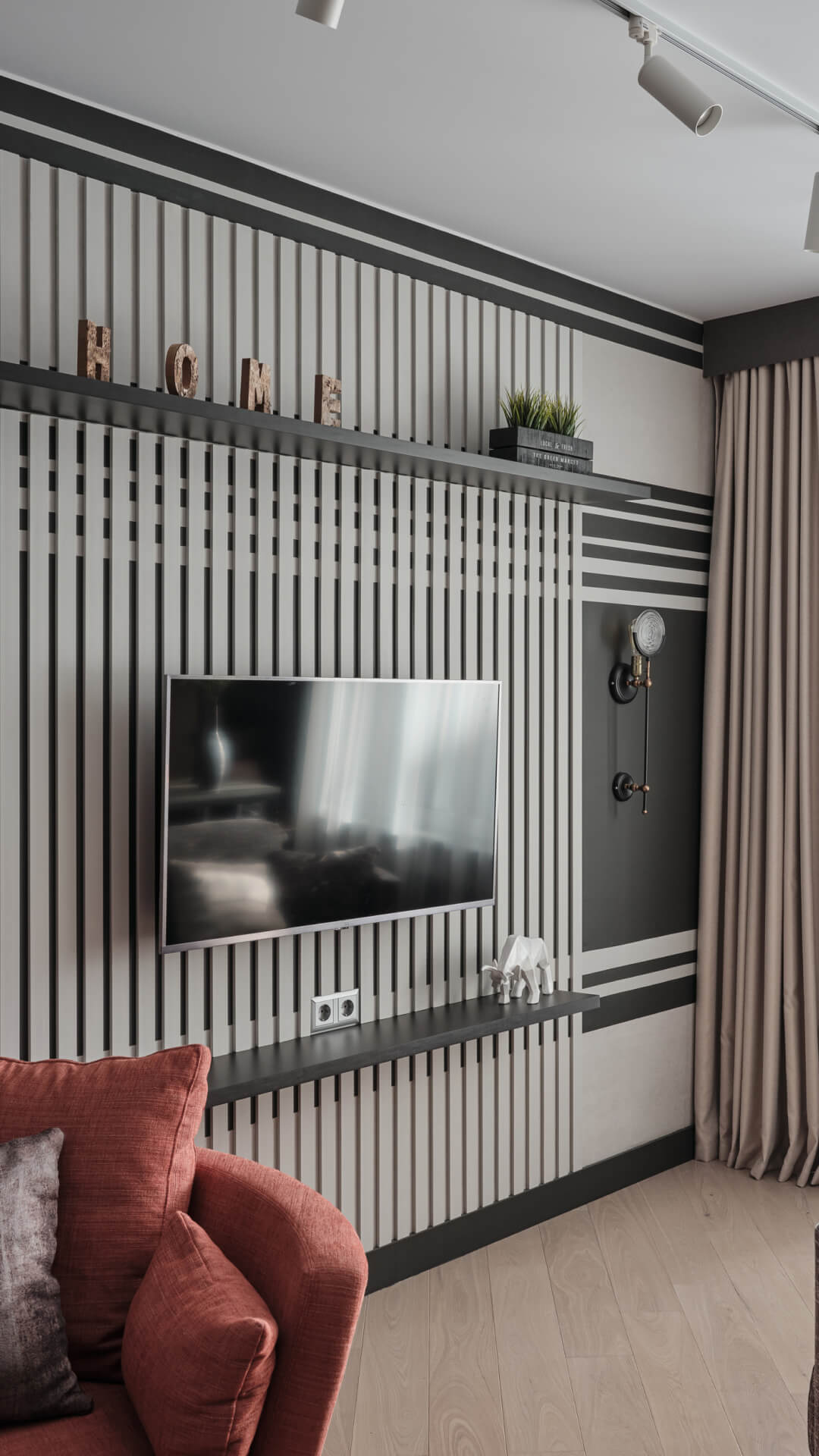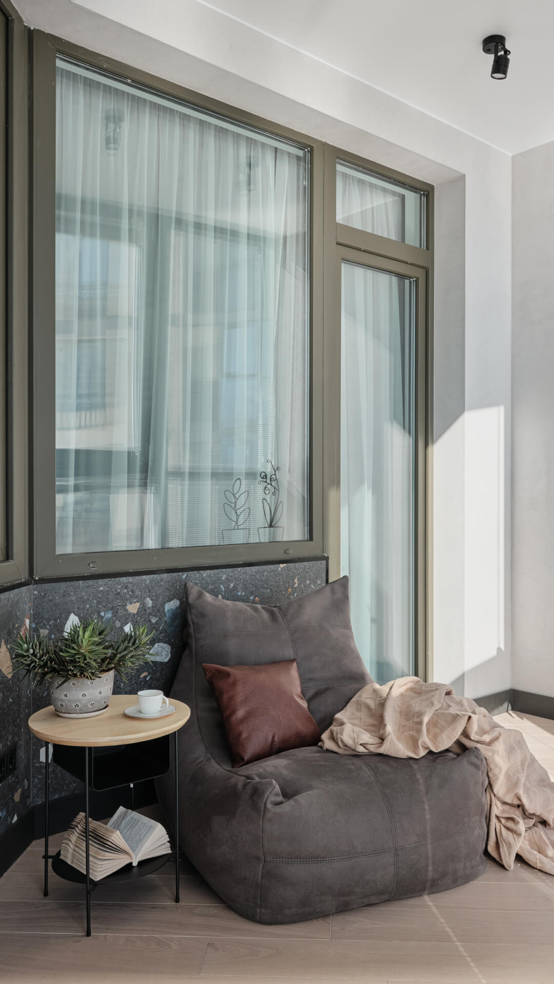 Petit appartement fait en colories sombres et élégants. Nous avons supprimé toutes les cloisons de l'appartement, en conservant seulement celle entre la salle de bains et le séjour. Nous avons ainsi créé un espace ouvert et fonctionnel, divisé par des meubles multifonctionnels encastrés et sur-mesure.
