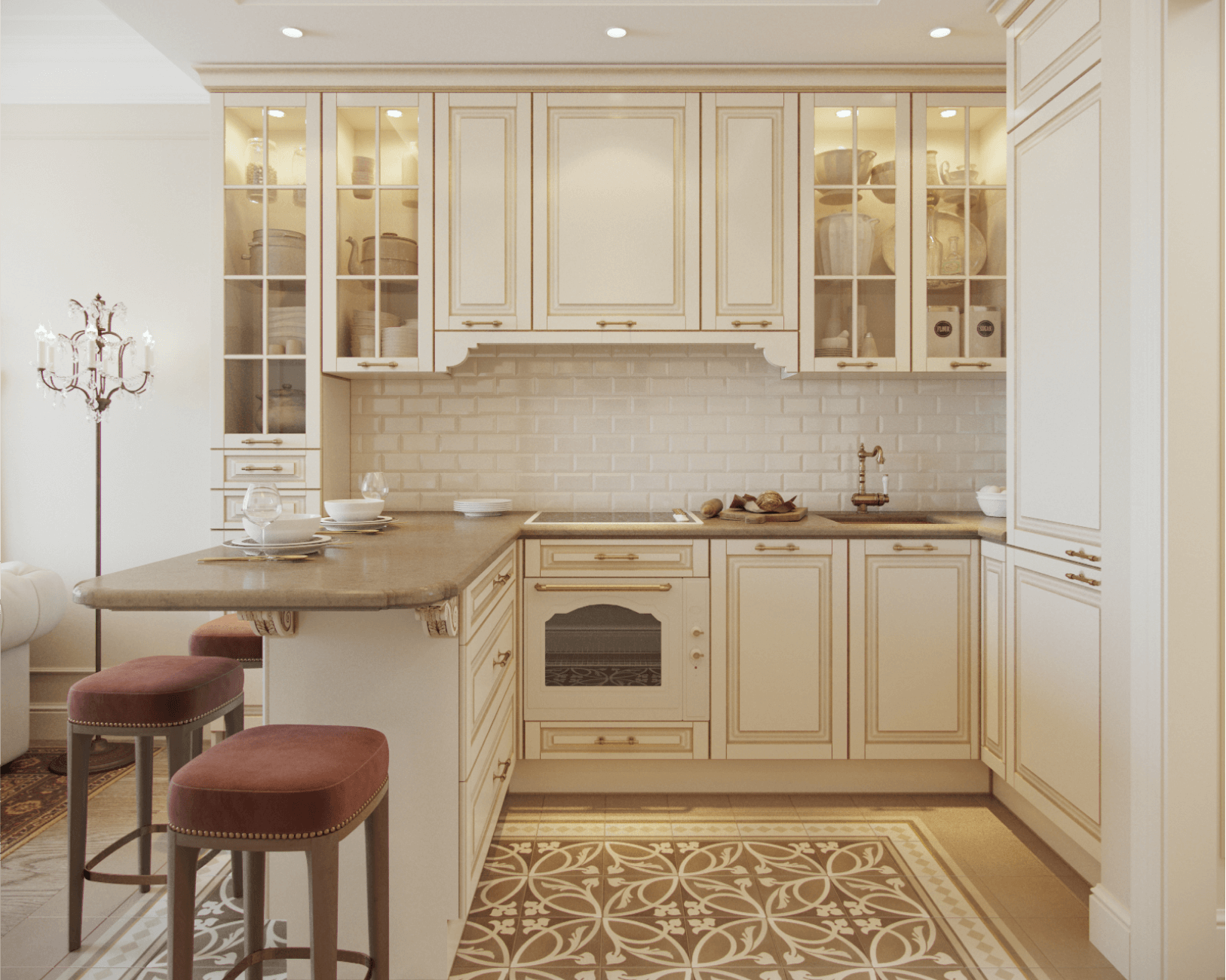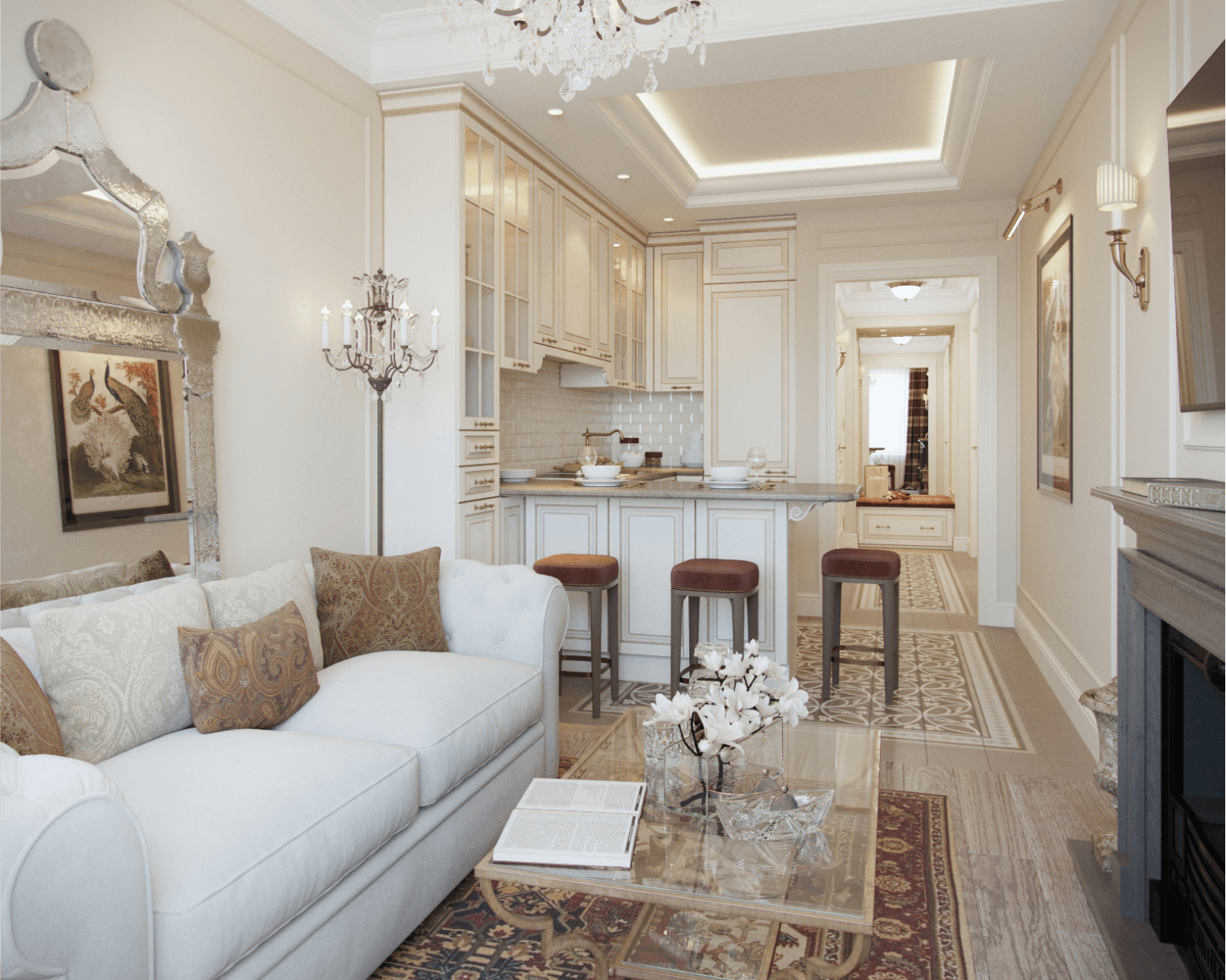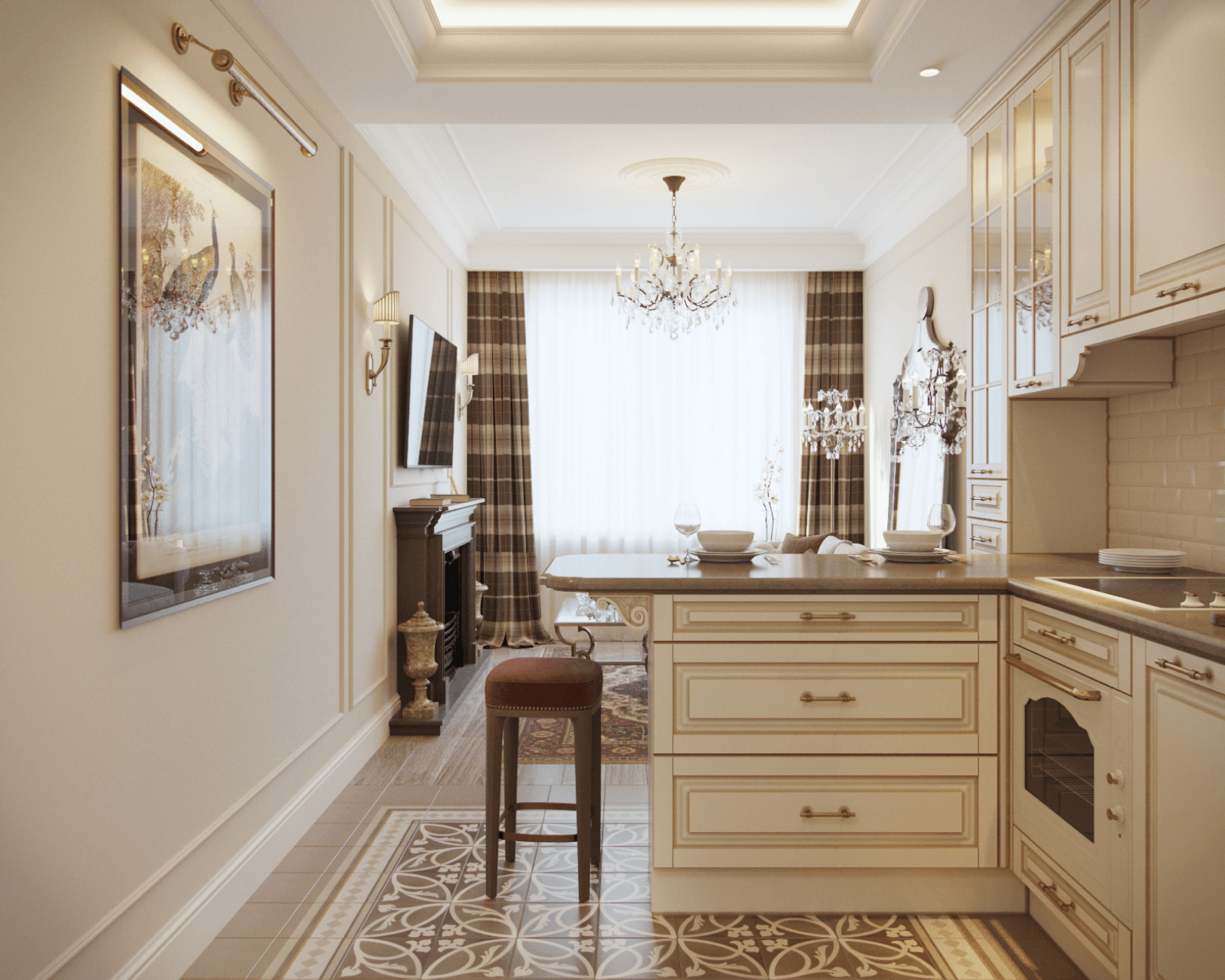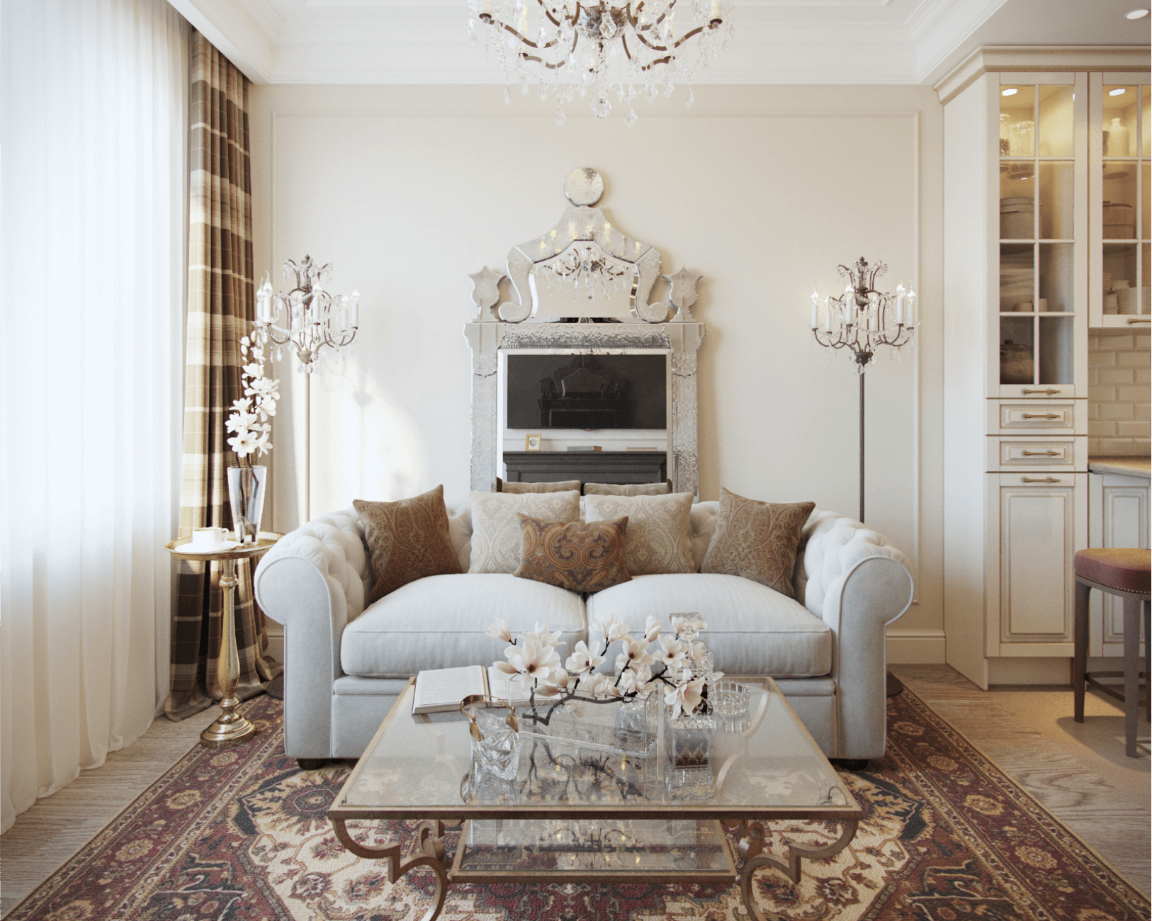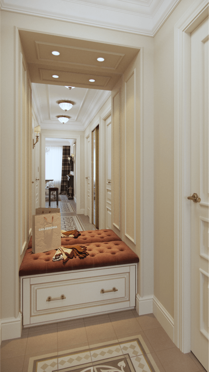 La richesse du décor de cet appartement du centre de Saint-Pétersbourg compense la monochromie des couleurs. Cette combinaison rend l'espace élégant et féminin.