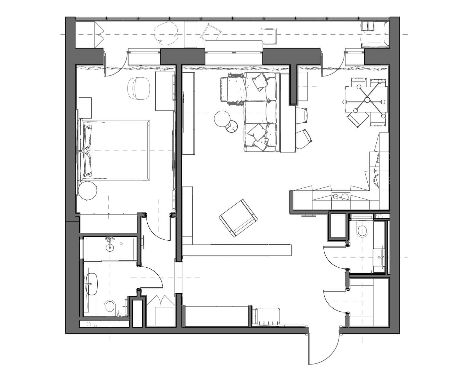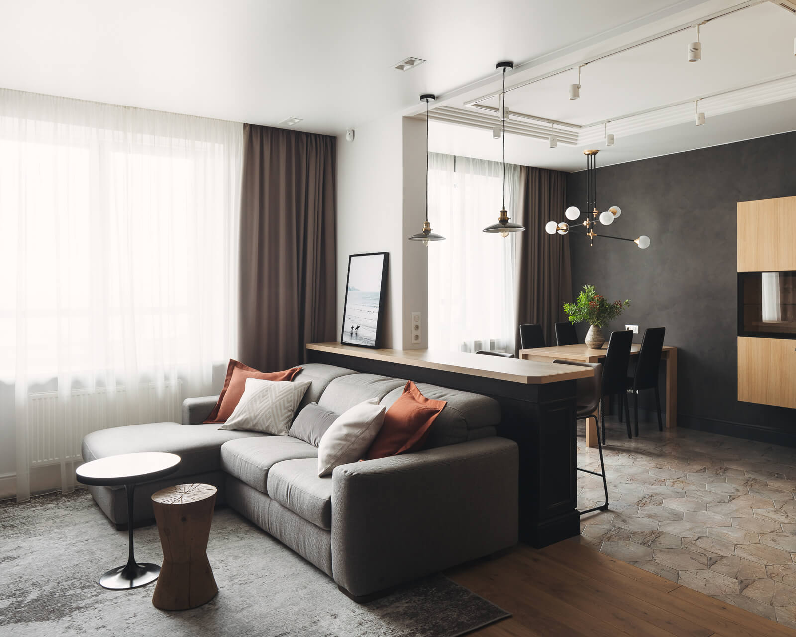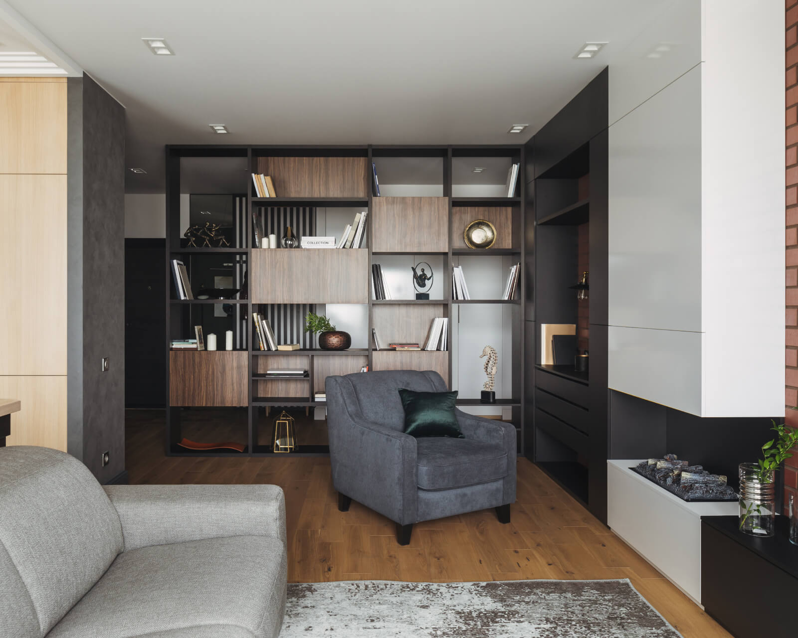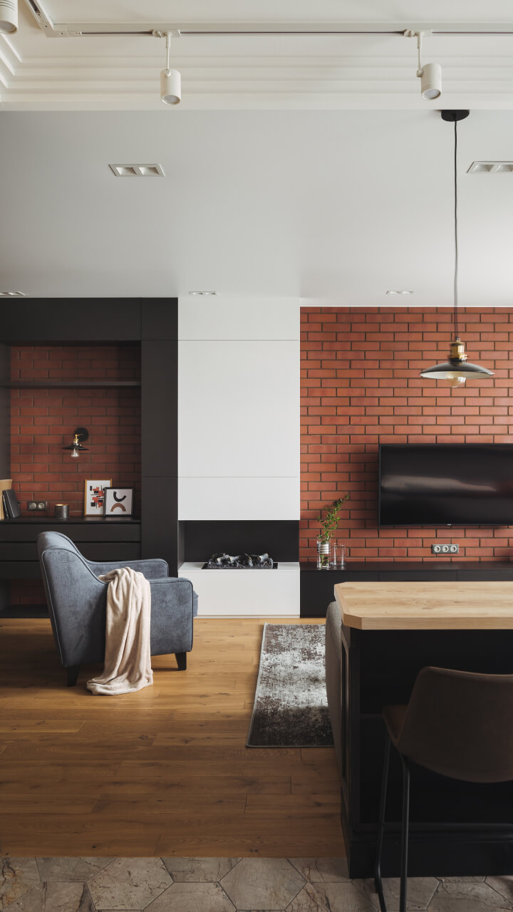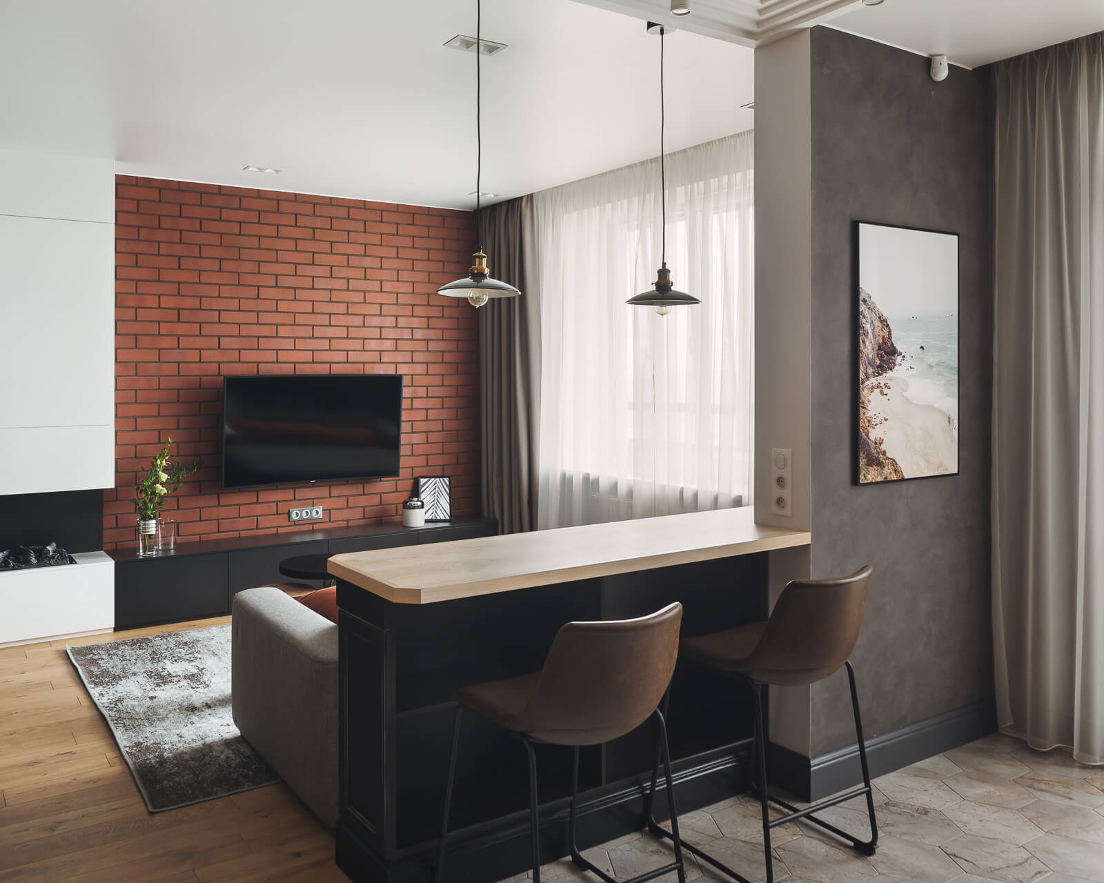 Le plan ouvert des espaces communs de la cuisine, du salon et du couloir contraste avec l'intimité totale offerte dans l'espace privé, composé d'une chambre et d'une salle de bain. De plus, cet appartement offre de généreux espaces de rangement. La combinaison choisie de brique, de pierre et de bois naturel montre le sens pratique du jeune propriétaire.