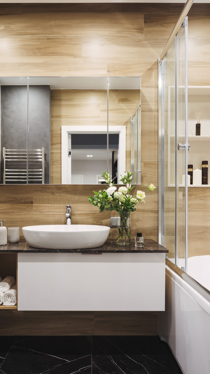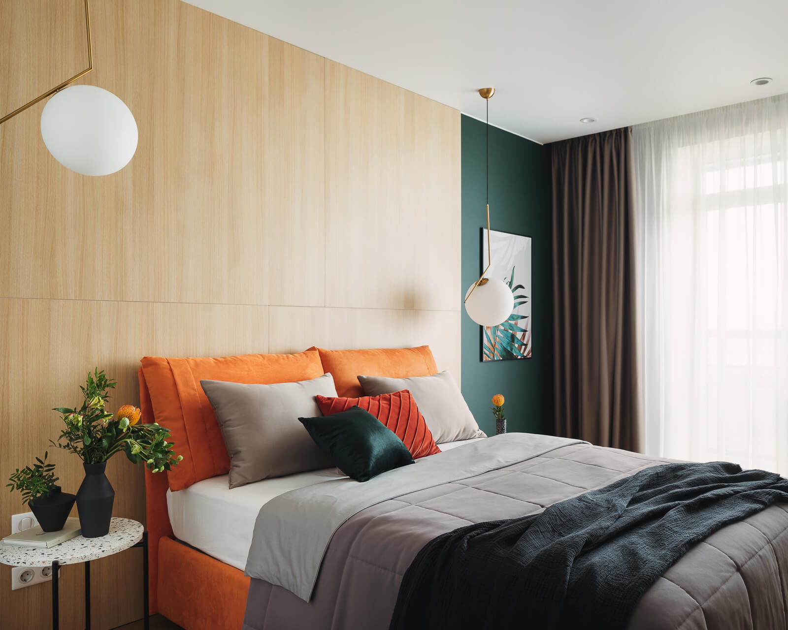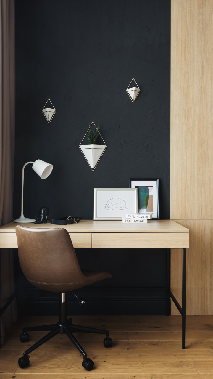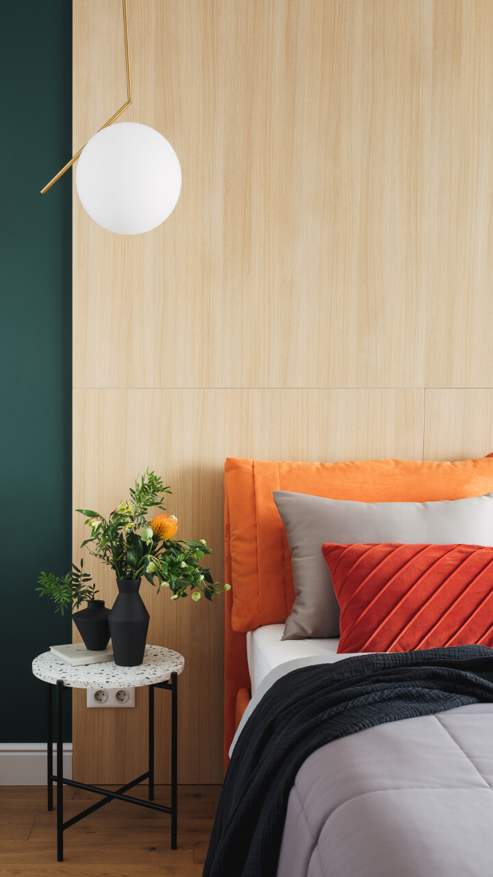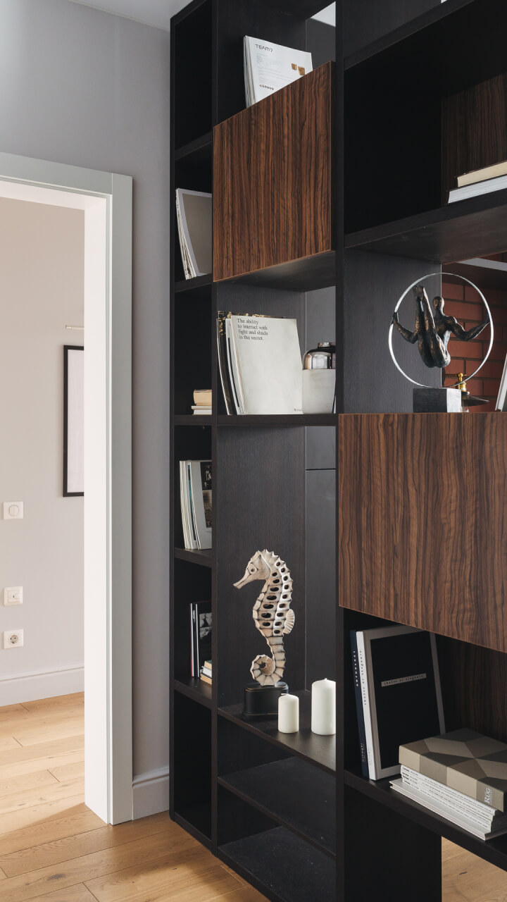 Le plan ouvert des espaces communs de la cuisine, du salon et du couloir contraste avec l'intimité totale offerte dans l'espace privé, composé d'une chambre et d'une salle de bain. De plus, cet appartement offre de généreux espaces de rangement. La combinaison choisie de brique, de pierre et de bois naturel montre le sens pratique du jeune propriétaire.
